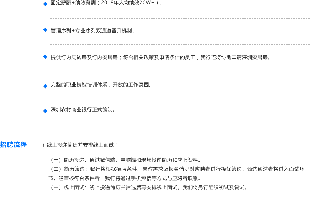 线上投递简历并安排线上面试应聘资料包含以下内容:(1)《深圳农村商业银行应聘登记表》(见附件);(2)个人简历;(3)个人成绩单复印件(4)生活照。