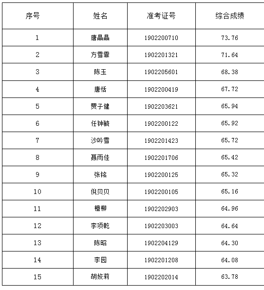 根据《石台农村商业银行2019年社会招聘简章》规定,经笔试、面试,按照考生笔试成绩占60%、面试成绩占40%的比例统计应聘者综合成绩,下列15人为本次招聘拟录用人员,现予以公示: