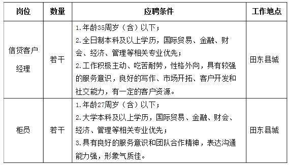 根据田东北部湾村镇银行业务发展需要,现面向社会诚邀英才。应聘人员一经录用,田东北部湾村镇银行将与其签订劳动合同,并提供具有市场竞争力的薪酬福利待遇和多元化的职业发展平台。