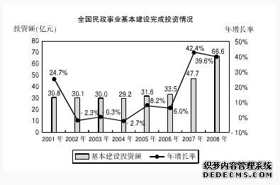 2008年,全国民政事业基本建设完成投资总额为66.6亿元,施工项目为3906个,完成投资总额比上年增长39.6%。其中国家投资26.6亿元,比上年增长83.4%。在投资总额中,用于优抚安置事业单位投资为9.6亿元,比上年增长88.2%;社区服务单位投资为5.2亿元,比上年增长52.9%;收养性单位投资为30.4亿元,比上年增长33.9%;殡仪服务单位投资为11.3亿元,比上年增长21.3%;救助类单位投资为2.6亿元,比上年增长100%;其他事业单位投资为7.5亿元,比上年增长27.1%。