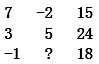 【东吴教育解析】九宫格数字推理。以行为规律,第三列数据=(第一列+第二列)×3。15=(7-2)×3、24=(3+5)×3、18=(-1+?)×3,故?=7,选C。