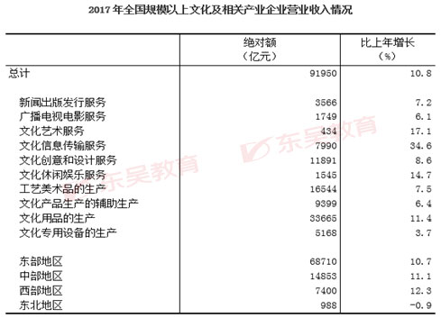 【2019年江苏农商行真题】据对全国规模以上文化及相关产业5.5万家企业调查,2017年,上述企业实现营业收入91950亿元,比上年增长10.8%,增速提高3.3个百分点,继续保持较快增长。