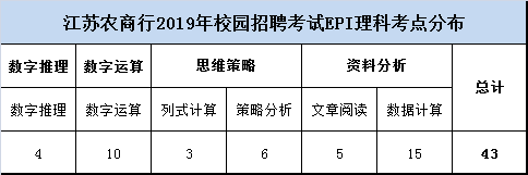 江苏农商行笔试EPI考试模块为:言语理解、数字运算、逻辑推理、思维策略和资料分析。