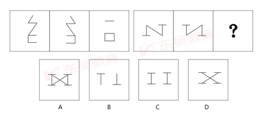 【东吴教育解析】第一组图形,前两个叠加,保留水平线和竖直线,按照这个规律,第二组问号处应选择C项。