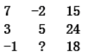 (2019年交通银行)下面是一个三行三列的数字阵型,填入问号处的数字为( )。