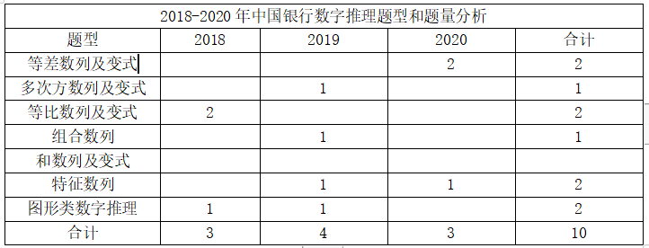 交通银行校园招聘考试中,数字推理一般放在逻辑判断当中考查,一般考查3-4题。数字推理题目涉及的考点较多,如:等差数列及变式、等比数列及变式、多次方数列及变式、和数列及变式、特征数列、组合数列、图形类数字推理。交通银行的数字推理题近三年题目相对常规,考生重点把握常考题型的题型特征和解题思路即可。以下是各年份数字推理题型和题量的分析数据:2018-2020年中国银行数字推理题型和题量分析