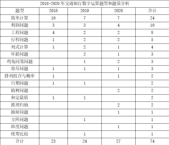 交通银行校园招聘考试中,前些年没有具体区分数字运算和思维策略,这两类题型往往合在一起考查,题量从近三年题量来看,2018年考查了23题,2019年考查24题,2020年总共考查27道题,其中思维策略各划分5题。这类题目主要考查考生对基本数字运算、对数据的理解和处理,以及在解决问题的发散思维能力。常考的题型:行程问题、工程问题、浓度问题、植树问题、利润问题、比例问题、几何问题、概率问题、鸡兔同笼问题、牛吃草问题、容斥问题、年龄问题等。考试难度一般中等偏下,大家可以提前进行有针对性复习。以下是近三年数字运算题型和题量的分析数据:2018-2020年交通银行数字运算题型和题量分析