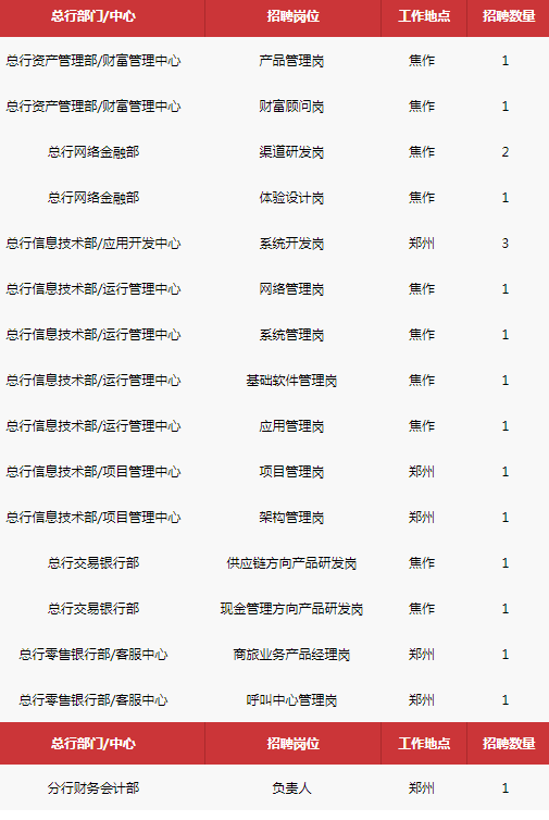 因工作需要,现公开招聘焦作中旅银行副行长、融资租赁公司财务总监等3个岗位。具体公告如下: