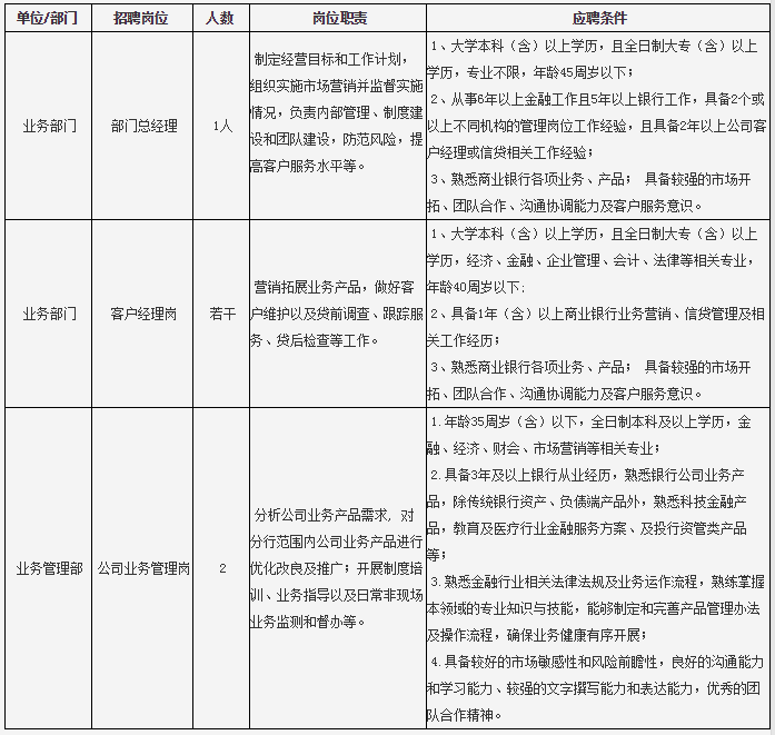 基本要求:具备与岗位相适应的工作经历和工作能力,熟悉银行业务,有良好的职业道德和团队意识,爱岗敬业,无违规违纪等不良记录。
