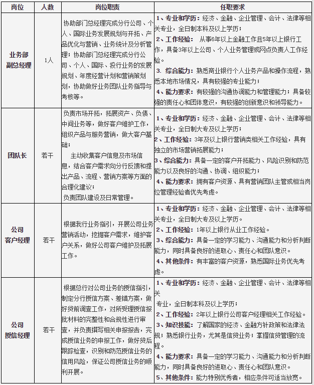 韶关分行现有营业网点二个、自助银行一个。为满足分行业务发展需要,现诚邀社会金融英才加入!
