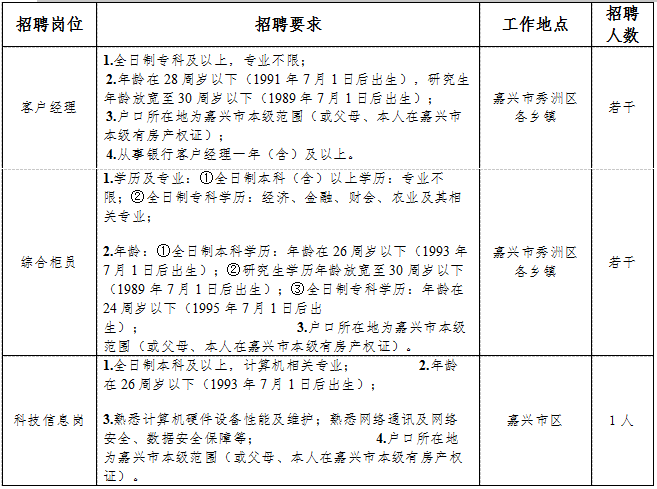 嘉兴监管分局批准设立,具有独立法人资格的新型农村中小金融机构,因业务发展需要,现面向社会公开招聘以下人才: