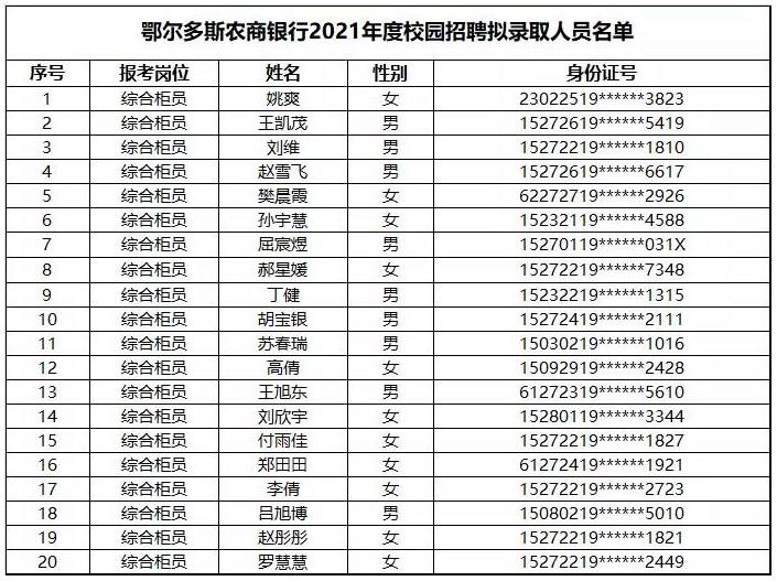 鄂尔多斯农商银行2021年度校园招聘,通过报名、审核、笔试、面试、体检、培训的招聘程序,拟录取人员20名。现将拟录取人员名单予以公示,公示期10月26日至11月1日,对本次公示内容有疑义的请在公示期内与鄂尔多斯农商银行联系。