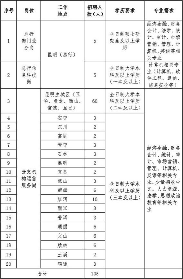 注:1.每人限报一个工作岗位;2.州市机构岗位含当地郊县网点。3.为帮助应届毕业生更快熟悉掌握富滇银行业务、产品和流程,原则上我们将安排录用至总行部门业务岗、信息科技岗的应届毕业生到分支机构锻炼,锻炼期满(总行部门业务岗2年、信息科技岗3-6个月),考核合格后安排到总行相关部门工作。