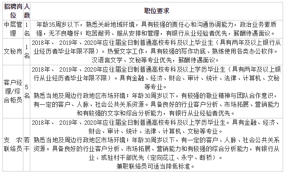 备注:客户经理综合素质突出、有丰富客户资源、人脉资源和社会公共关系资源者,上述职位要求可适当放宽条件。