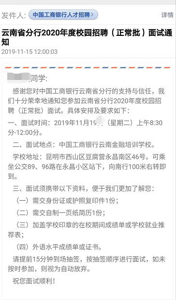 > [云南]2020中国工商银行云南分行校园招聘面试通知