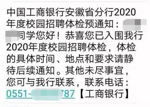 [安徽]2020年中国工商银行安徽分行校园招聘体检预通知