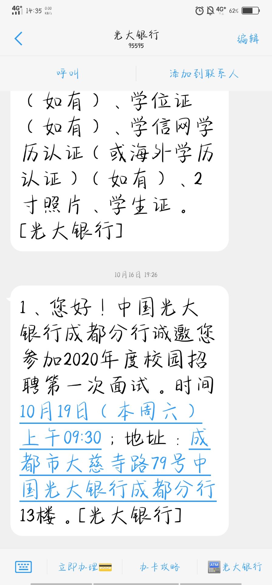 > [四川]2020中国光大银行成都分行校园招聘第一次面试通知