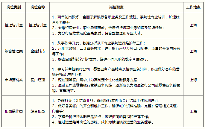 秋季校园招聘岗位分为管理培训生、综合管理类(如风险管理、金融科技等)、市场营销类(如客户经理、营销经理等)、柜面操作类(如综合柜员、专职柜员等)共4大类岗位。岗位说明如下: