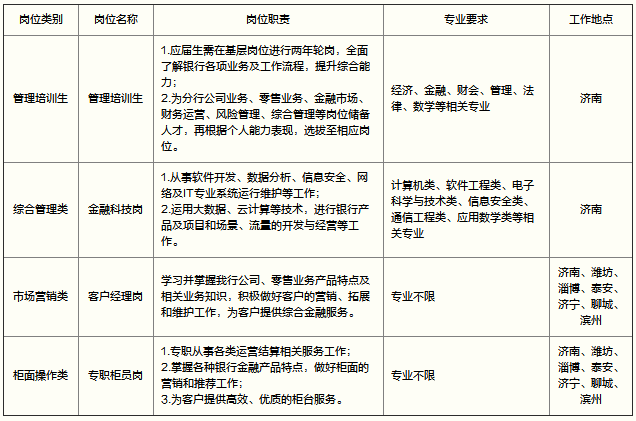 秋季校园招聘岗位分为管理培训生、综合管理类、市场营销类、柜面操作类共4大类岗位。岗位说明如下: