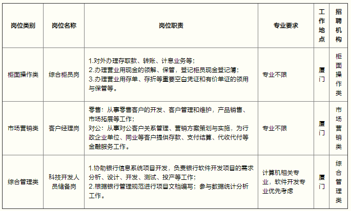 秋季校园招聘岗位分为、综合管理类(如风险管理、金融科技等)、市场营销类(如客户经理、营销经理等)、柜面操作类(如综合柜员、专职柜员等)共3大类岗位。岗位说明如下: