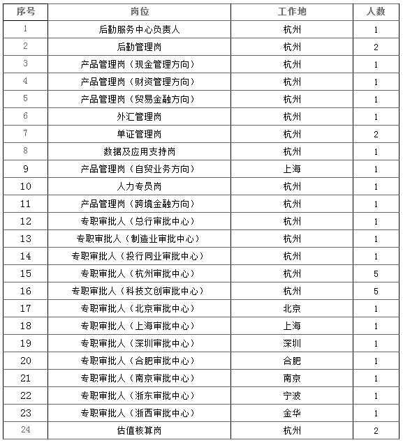 三、招聘岗位信息可浏览附件及杭州银行官方网站(http://www.hzbank.com.cn),应聘者请进入我行官网首页“人才招聘”模块注册用户信息、填写个人简历后进行网上报名。