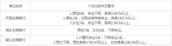 根据招聘计划和有关要求,天易、湘乡和韶山农商银行本次面向社会公开招聘员工共32名。其中天易农商银行17名、湘乡农商银行13名、韶山农商银行2名。