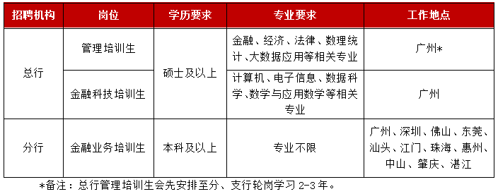 1.总行管理培训生:通过基层一线的全面轮岗学习及总行管理职能岗位锻炼,培养各领域精通专业、了解市场、勇于作为的金融专才。
