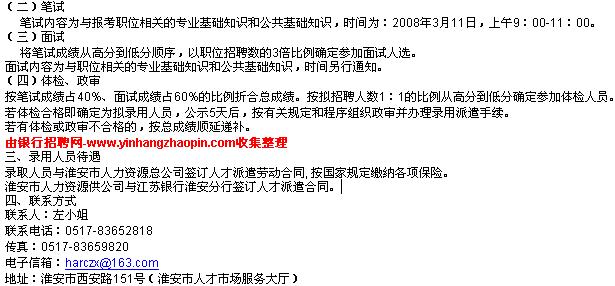 淮安市人力资源总公司受江苏银行淮安分行委托,面向社会公开招聘工作人员8名,具体招聘方法公布如下: