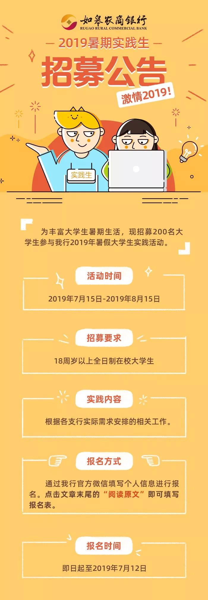 > [江苏]2019年如皋农商银行暑期实践招聘公告
