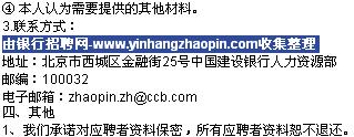 同时,将填写好的《报名表》签名确认后,贴上照片(近期2寸正面免冠彩色),附下列材料后邮寄至中国建设银行人力资源部(请在信封左下角注明“应聘”字样;截止时间以邮戳为准):