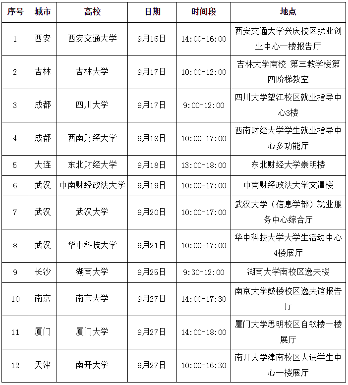相关情况,我行拟于9月至10月在全国部分城市举办校园宣讲或见面会。欢迎同学们踊跃参加!相关安排详见下表。