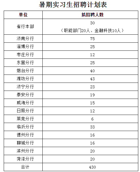 (一)职能部门实习生。分配至山东省分行本部各部门,主要参与公司业务、个人金融、国际业务、金融市场、投资银行、私人银行、普惠金融、住房金融、风险管理等相关职能部门的工作。本次山东省分行仅招收省分行本部的职能部门实习生。