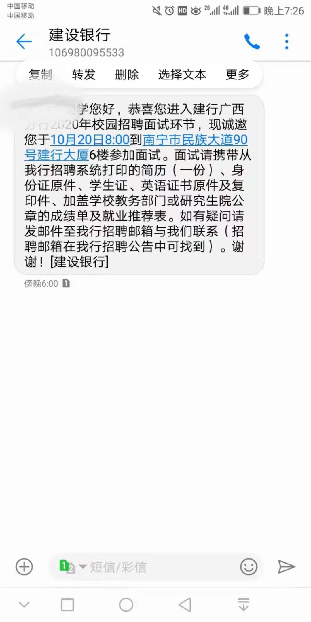 [广西]2020中国建设银行广西分行校园招聘面试通知
