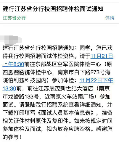 > [江苏]2020年中国建设银行江苏省分行校园招聘体检面试通知