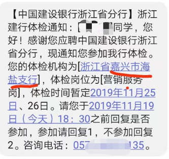 > [浙江]2020年中国建设银行浙江分行校园招聘体检通知
