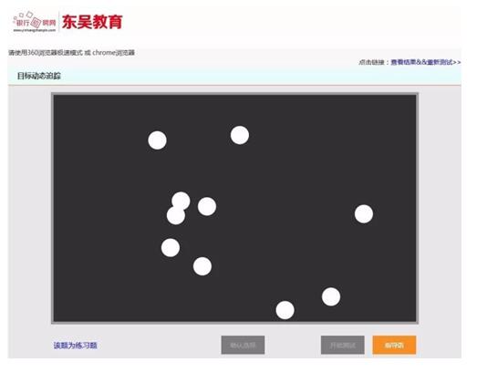 屏幕上会出现10个圆球,其中有3-5个圆球将闪烁,闪烁的圆球即为需要追踪的目标,请记住它们。追踪目标闪烁后,10个圆球都会运动;但圆球运动停止后它们会变成正方形,请用鼠标选出之前闪烁的追踪目标进行作答。鼠标点击一次即为选中,被选中的目标显示橙色边框,在点击一次则取消选择。