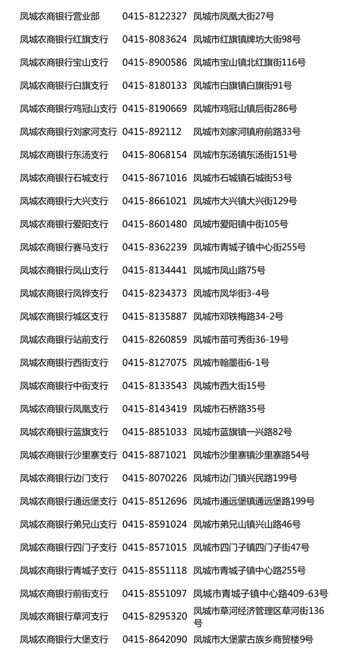 凤城农商银行辖内28家营业网点。