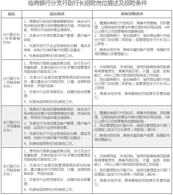 临商银行分支行副行长招聘岗位描述及招聘条件