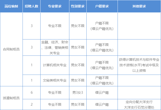 (六)应聘派遣制定向分配者,定向分配网点为大洋支行、大洋支行石笕分理处,定向服务年限不少于5年。