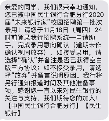 2020中国民生银行合肥分行校园招聘录用通知