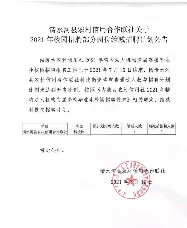 [内蒙古]2021呼和浩特清水河县农信社校园招聘部分岗位缩减招聘计划公告