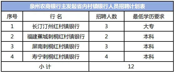 泉州农商银行主发起设立的村镇银行坚守“支农支小”市场定位,秉承“小特精美”的经营方针,坚持以服务三农、助力小微、造福民生为宗旨,不遗余力地促进地方城乡经济统筹协调发展。现因业务发展需要,4家村镇银行合计招聘正式员工12人,具体以招聘行所在地生源为主(详见下表)。各村镇银行将为录用人员提供具有竞争力的薪酬待遇、广阔的成长空间及良好的事业发展平台!