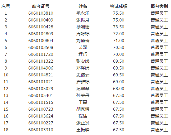 一、面试入围人员:共18名(最后一名入围面试人员笔试成绩有并列,一同入围面试),具体名单见附件。