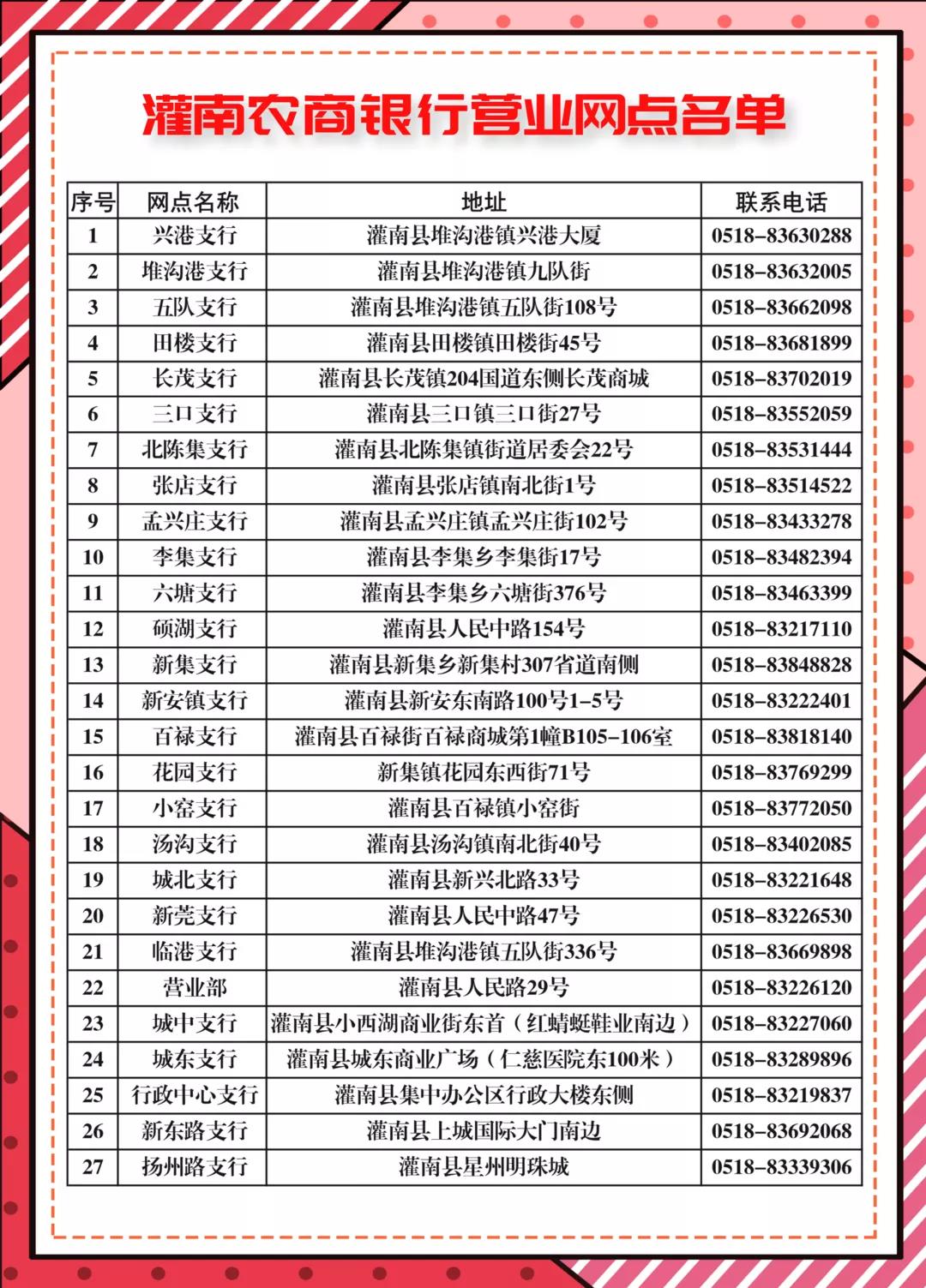 江苏灌南农村商业银行以“服务三农、服务小微企业、服务城乡百姓”为市场定位,以“打造更具有综合竞争力的地方特色银行”为愿景,以“诚 融灌南 智 惠农商”为使命,牢牢扎根县域市场不动摇,是地方经济发展的金融主力军。目前全辖共27个营业网点,分布在灌南县城乡。
