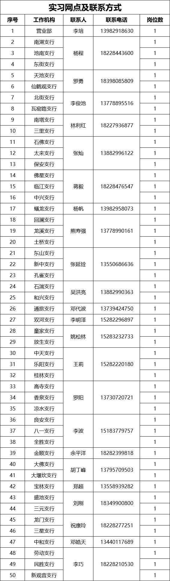 实习网点及联系电话