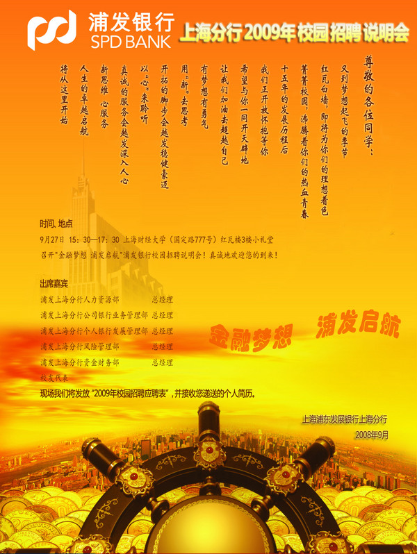 上海浦发银行上海分行2009校园招聘说明会(上海财经大学专场,9月27日)