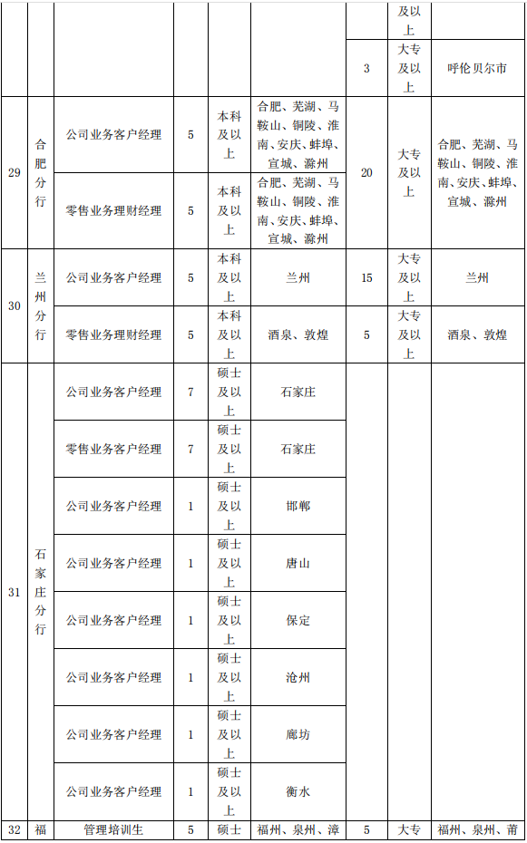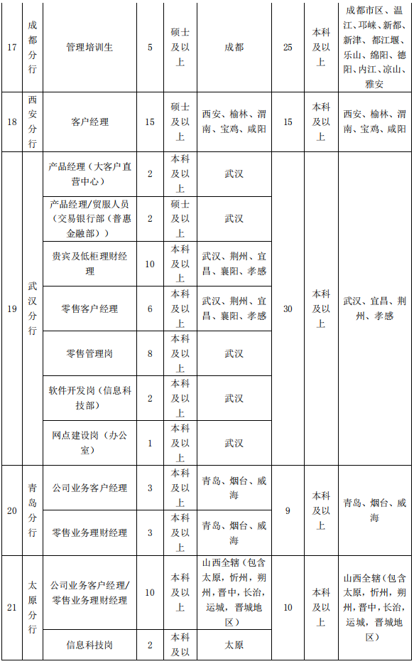 3、专业不限,其中总行信息科技部招聘岗位以计算机与信息技术、大数据挖掘、软件工程、人工智能、金融工程、统计学等理工科专业为主。