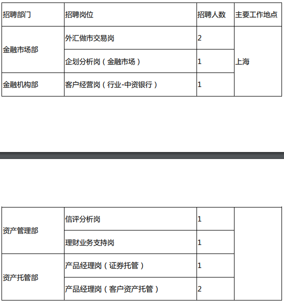 应聘条件:35周岁以下;金融学、管理学、经济学、法律等专业全日制本科及以上学历;3年以上金融行业从业经历;具有较强的市场营销和金融产品设计能力;熟悉私募基金、信托、互联网金融及各类客户资金等托管产品的某一领域或多个领域;具备一定的英语听读写说能力。