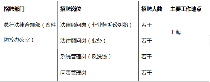 应聘条件:40 周岁以下;法律等相关专业全日制本科及以上学历;通过全国司法或律师资格考试;5 年以上银行等金融机构/知名律所/法院/企业集团相关金融法律工作经验; 具备较扎实法律理论功底和较丰富法务实践经验;对银行法律风险管理具备一定认识或研究; 工作勤奋踏实、诚实守信,具有较强的组织管理、协调沟通能力;具有较强的文字表达能力 和英语水平。