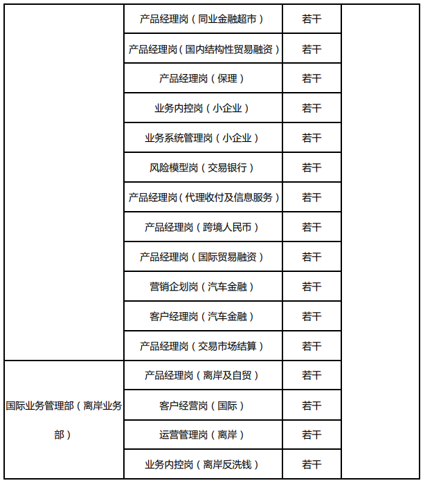 ¡¡¡¡Ó¦Æ¸Ìõ¼þ£º35 ÖÜËêÒÔÏ£»¹ú¼ÊóÒס¢¹ú¼Ê½ðÈÚ¡¢¹ÜÀíѧ¡¢½ðÈÚѧ¡¢¾¼Ãѧ¡¢·¨ÂɵÈÏà¹Ø×¨ÒµÈ«ÈÕÖÆ±¾¿Æ¼°ÒÔÉÏѧÀú£»2 ÄêÒÔÉÏÒøÐÐÒµÏà¹Ø×¨ÒµÁìÓò´ÓÒµ¾Àú£»¾ßÓÐÁ¼ºÃµÄÓ¢ÓïÌý˵¶ÁдÄÜÁ¦£¬´óѧӢÓï 6 ¼¶ÒÔÉÏ£»ÊìÁ·ÕÆÎÕ¸÷ÀàÓëÒµÎñÏà¹ØµÄ¹ú¼Ê¹ßÀýºÍ¹æÕÂÖÆ¶È£¬°üÀ¨